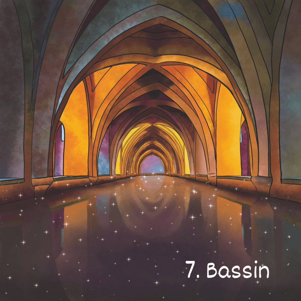 j’avoue que celle-ci m’a posé un petit souci au départ. Comment illustrer le goût? Ces cartes des sens sont vraiment compliquées, parce qu’elles se rapportent à des perception et non à des choses matérielles… je suis restée coincée pendant un bon moment, devant ma page blanche… et pendant l’une de ces occasions, je me suis mise à rire tellement fort que j’en ai renversé mon thé sur la table… Pendant tout ce temps, à chaque fois, je buvais du thé en pensant à ce que je pouvais bien dessiner… dans un bol… j’ai une belle collection de tasses, mugs et bols, mais aucun d’entre eux ne me paraissaient correspondre à l’idée que je voulais exprimer…. je suis allée en ligne pour chercher l’inspiration… rien… et puis une amie a posté l’image d’un bol pour illustrer une citation. Et c’était exactement ce que je cherchais. Sa forme, la manière donc ses couleurs s’organisaient… Et j’ai laissé l’inspiration prendre les rênes. Mon bol n’a que peu de choses à voir avec le sien, mais l’essentiel est là. Je voulais qu’il ait l’air un peu magique, pour célébrer ce moment d’inspiration fulgurante. Et j’ai décidé de le poser sur un rocher. J’aime vraiment la manière dont j’ai réussi à le faire, à le texturer. J’ai dessiné le Bosquet comme à mon habitude, mais il était trop présent, alors je l’ai flouté pour le laisser dans l’arrière plan. Mais voila, tout était trop neutre et froid autour du bol, qui lui était bien trop vif… je devais trouver un moyen de lié tous les éléments les uns aux autres… Je me suis reculée un peu sur ma chaise, pour réfléchir à ce que je pouvais bien faire, et un rayon de soleil m’a heurtée directement dans les yeux… Oh! D’accord! J’ai ajouté le rayon de soleil en le faisant heurter le bol, pour lui donner ce petit plus que j’appelle inspiration … quelques étincelles pour finir et c’est ainsi que la magie est née!